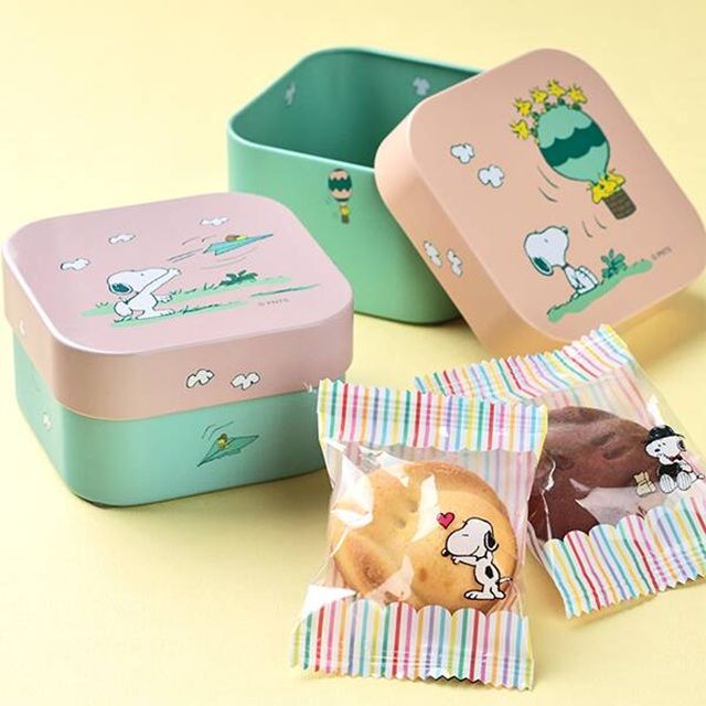 スヌーピーのイラストがかわいい手のひらサイズのキューブティンです。なかにクッキーが入っています。缶のデザインは2種類!