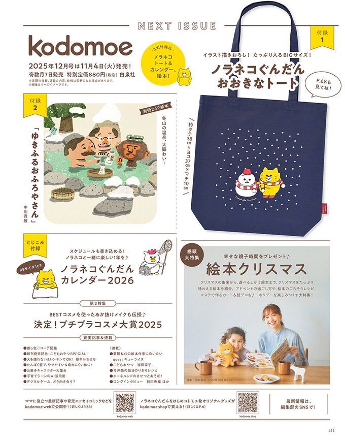 kodomoe(コドモエ) 2025年12月号が11月4日より新発売!ノラネコぐんだんおおきなトートバッグ&カレンダーの付録も!