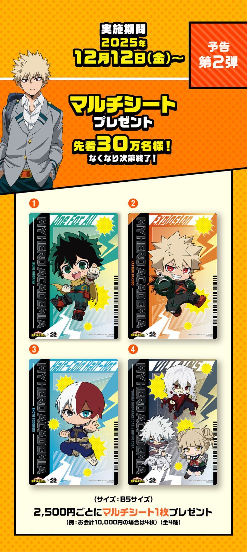 くら寿司「ヒロアカ」コラボキャンペーンが2025年11月、12月に実施!クリアファイル、マルチシート、アクリルスタンドのおまけ!ビッくらポンはラバーアクセサリー、缶バッジ、マグネットシートも!開催期間、口コミ、売り切れまとめ!