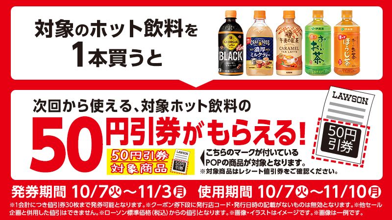 対象のホット飲料を1本購入ごとに、次回から使える、対象ホット飲料の50円引券がレシートについてきます。