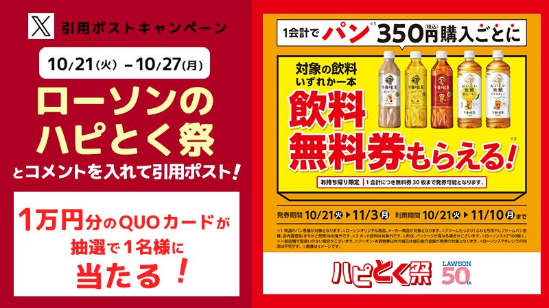 ローソンでは、2025年10月21日(火)より「秋のハピとく祭」にて、無料引換券がもらえるなどの大型キャンペーンの後半を開催します!