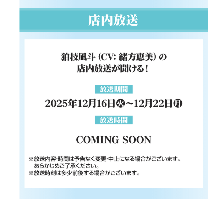 狛枝凪斗(CV:緒方恵美)の店内放送が聞ける!