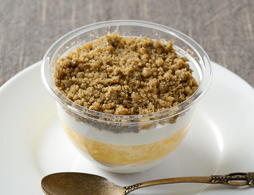 ふわとろ食感のほうじ茶ムースにきな粉クリームを重ね、粒あん、もちもちの白玉を添えた和風スイーツ。