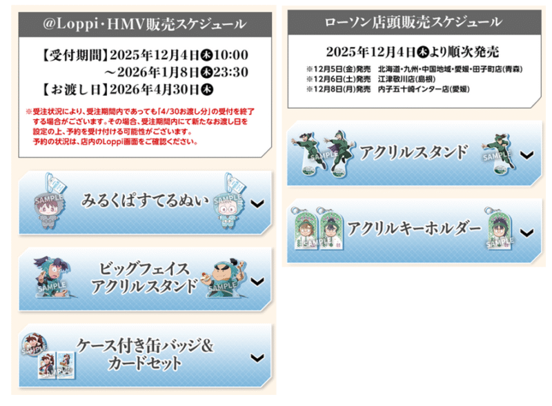 | 2025年12月4日(木) | アクリルスタンド、アクキー、プリントブロマイドなど |