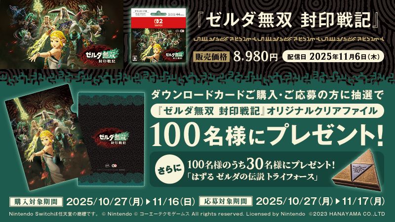 キャンペーン期間中に、『ゼルダ無双 封印戦記』ダウンロードカードを購入し、キャンペーンサイト内の応募フォームより、購入したカード番号で応募すると、抽選で100名様に『ゼルダ無双 封印戦記』オリジナルクリアファイルをプレゼント!