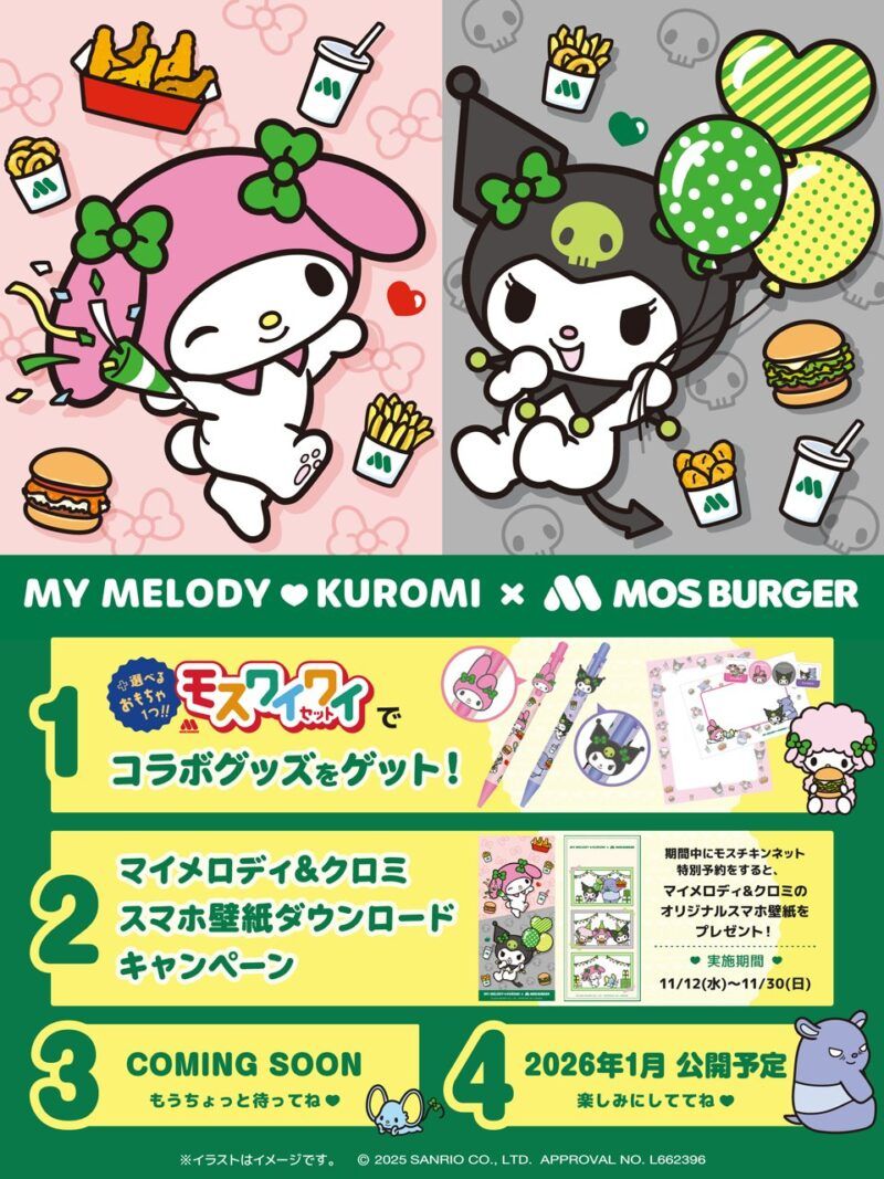 モスバーガーは、2025年11月12日(水)から全国のモスバーガー店舗(一部店舗除く)にて、株式会社サンリオの「マイメロディ」および「クロミ」との複数のコラボレーション企画を期間限定で実施します。