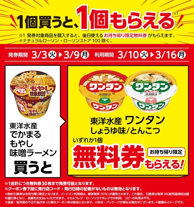 | ファミマル だしの旨み 鴨だしそば大盛、あさりとキムチ味 チゲうどん 大盛 | マルちゃん ワンタン しょうゆ味、とんこつ、スープカレー いずれか1個もらえる ※スープカレーは、北海道のみ対象です。 |
