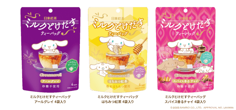 「ミルクとけだすティーバッグ」の人気3フレーバーのパッケージにサンリオの人気キャラクター「シナモロール」が登場。