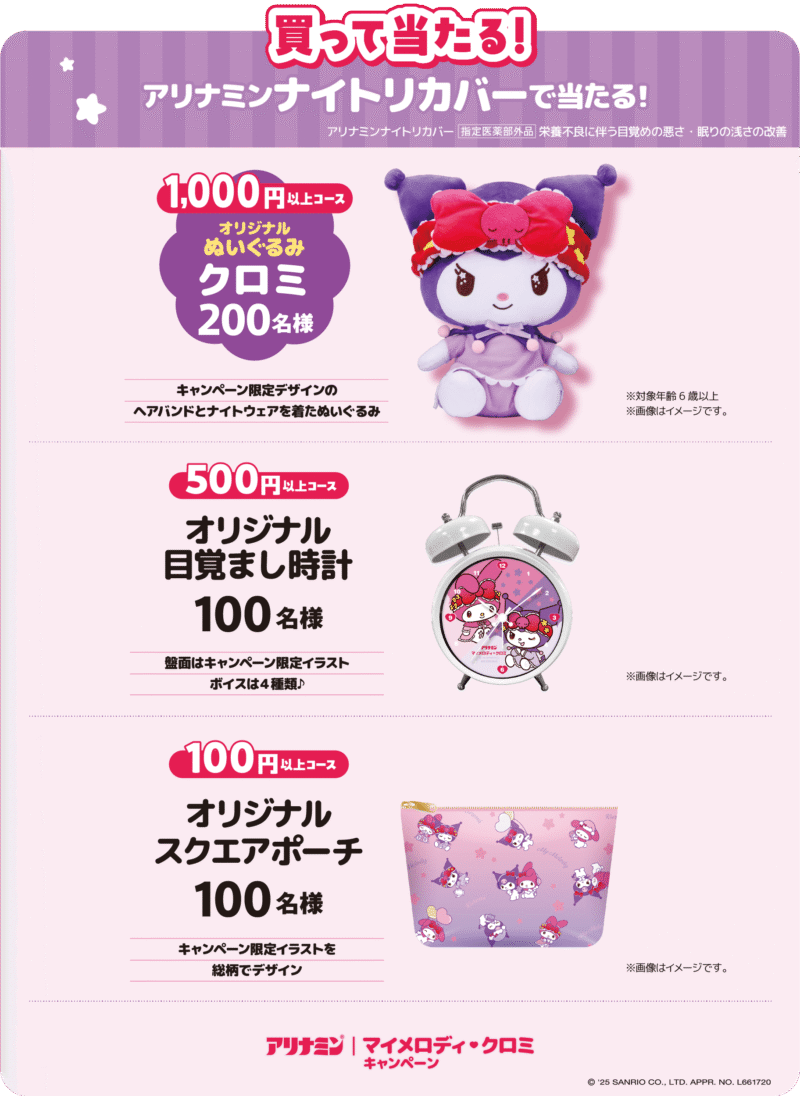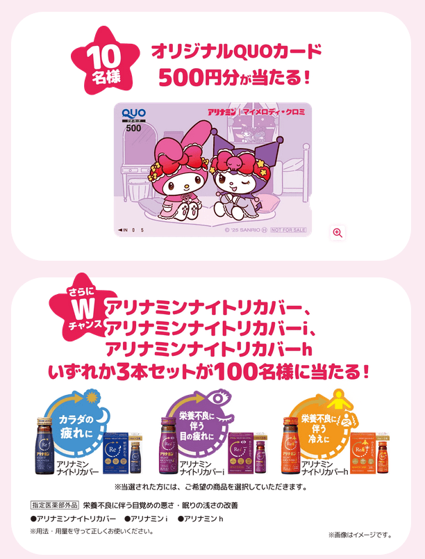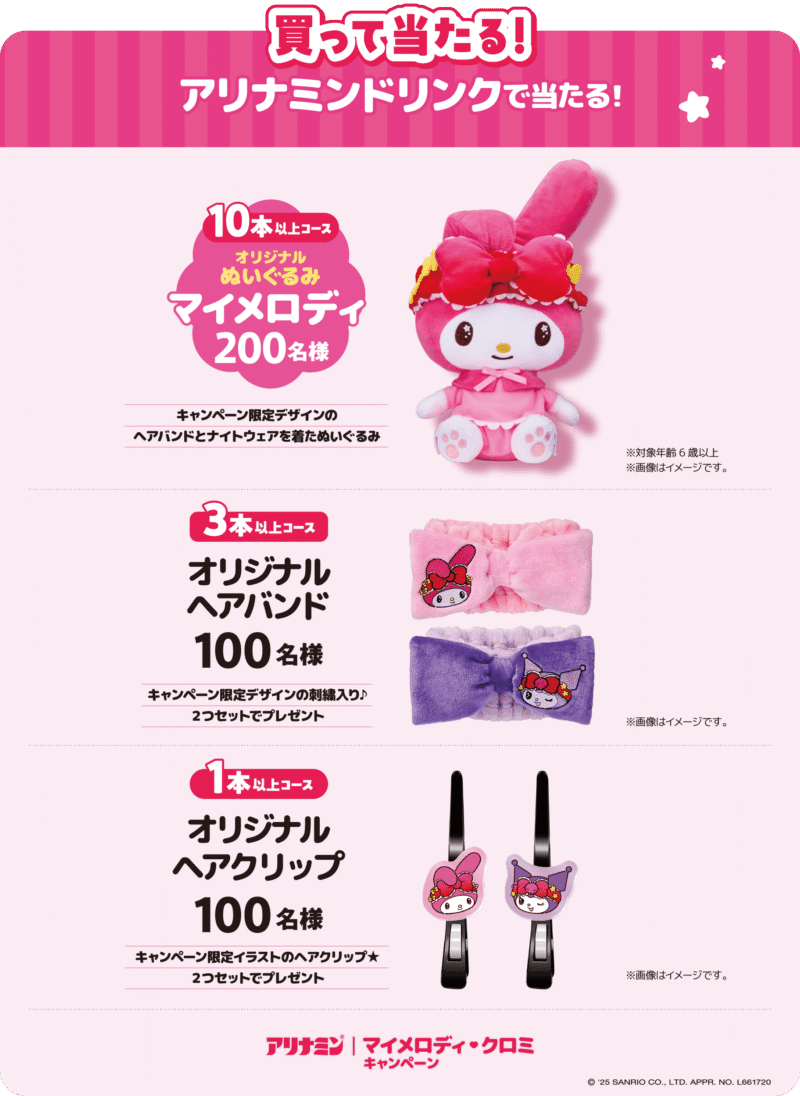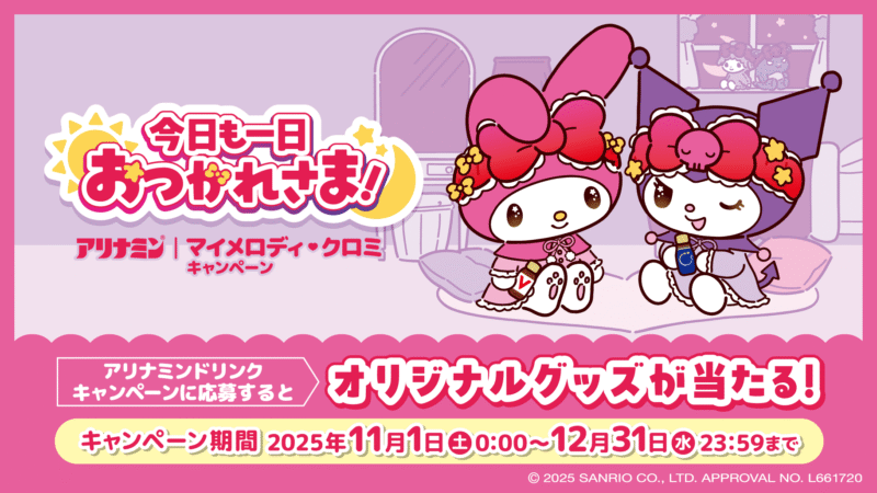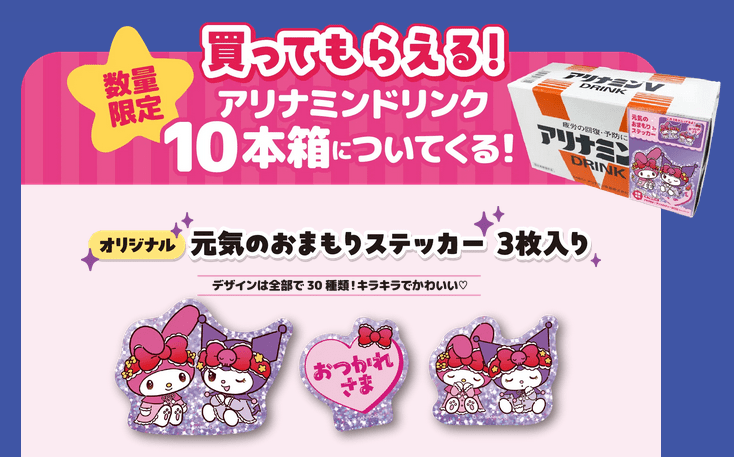 アリナミンでは、『サンリオ マイメロディ♡クロミ』コラボのキャンペーンを開催します!対象商品を購入するとオリジナルグッズがもらえるなども展開すると思います!