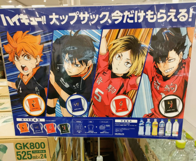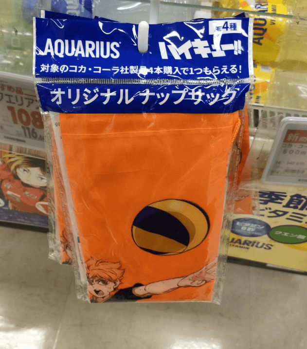 アクエリアス『ハイキュー!!』コラボ!ナップサックおまけが店頭でもらえるキャンペーンの開催店はどこ?日向、影山、黒尾、研磨の全4種類!コカ・コーラいろはすも対象商品!