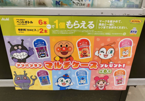 アサヒ飲料のペットボトルを4本、または、カルピス希釈用を2本購入すると、アンパンマンがまぐちポーチが貰えるキャンペーンを実施していました。