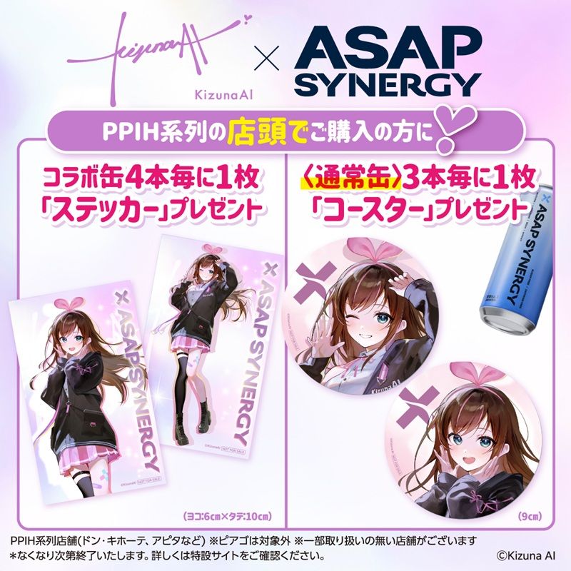 キャンペーン期間中にPPIH系列店舗(ドン・キホーテ、アピタなど)で「ASAP SYNERGY×Kizuna AI(キズナアイ)」コラボ缶を購入でもれなく1枚「ステッカー」「コースター」をプレゼント!