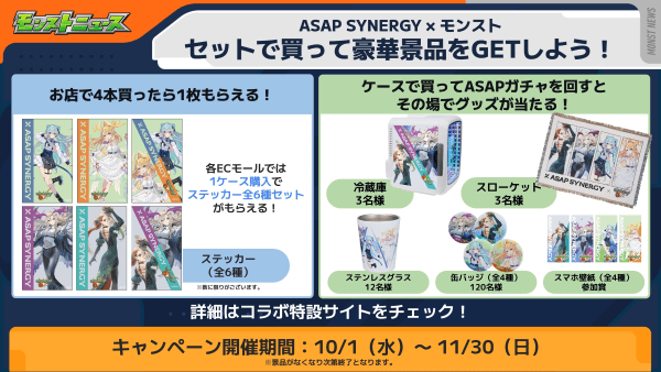 シナジードリンク ASAP SYNERGYでは、2025年10月から『モンスターストライク(モンスト)』コラボのキャンペーンを開催します!対象商品を購入するとオリジナルステッカーのおまけがもらえます!