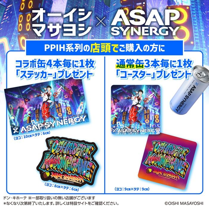 キャンペーン期間中にPPIH系列店舗(ドン・キホーテ、アピタ・ピアゴなど)で「ASAP SYNERGY×オーイシマサヨシ」コラボ缶を3本ご購入でもれなく1枚「オリジナルステッカー」をプレゼント!