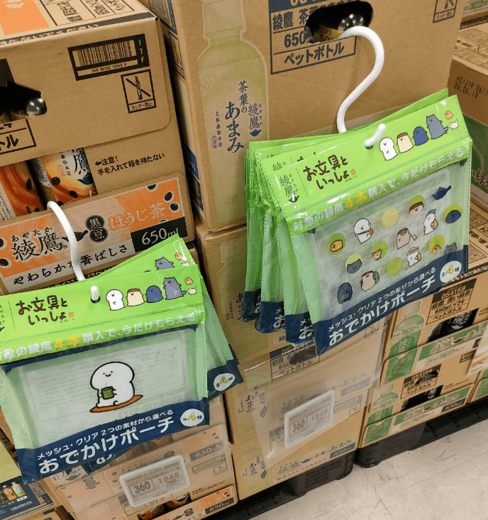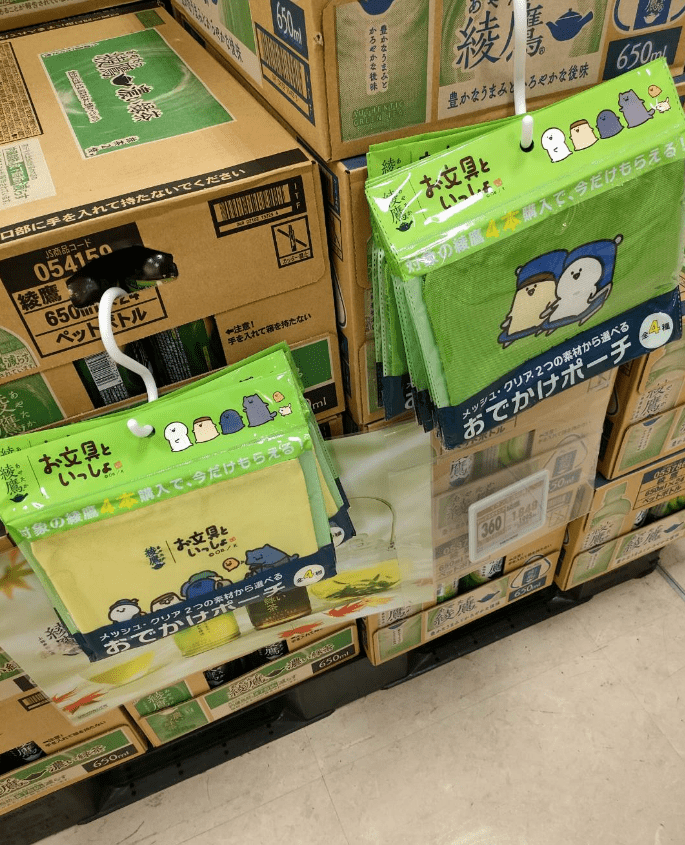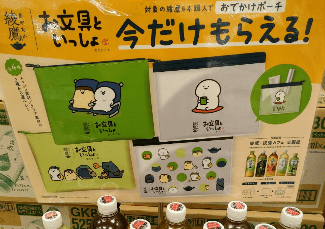 コカ・コーラ社の製品を取り扱う実店舗にて対象の「綾鷹」製品を4本購入すると、『お文具といっしょ』オリジナルデザインのポーチを1点もらえます!