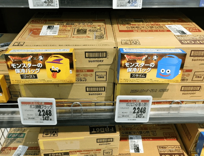 今日から缶ボスについてくるドラクエ保冷バッグだけどドンキ行ったら確認もされずに売り切れたとか明らかな嘘を言われイオンに行ったら奥から出してもらえた