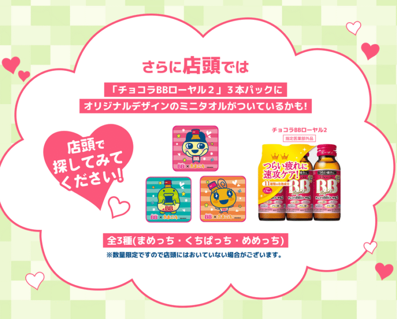 チョコラBBローヤル2の3本セットを購入すると、たまごっちのミニタオルが付いてました。
