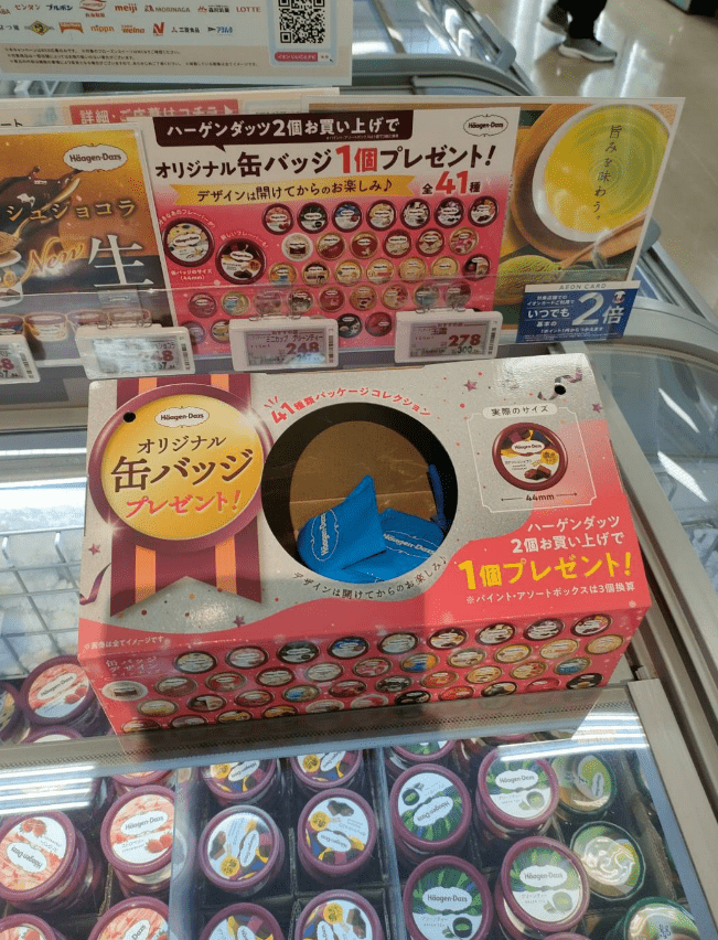 ハーゲンダッツを2点購入すると、オリジナル缶バッジが貰えるキャンペーンを実施していました。