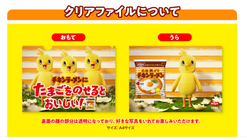 橋本さん&猪俣さん&篠塚さんがひよこちゃんに ! 「チキンラーメンオリジナル橋本さん、猪俣さん、篠塚さんクリアファイル」のおまけが、店頭で対象商品を購入するともらえます!