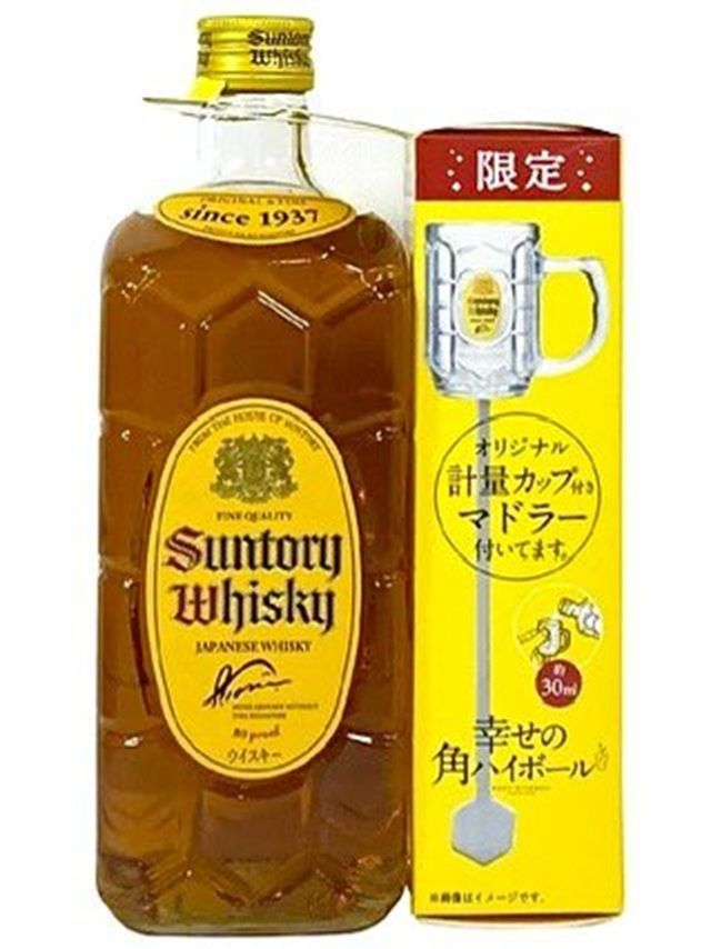 妹が買ってくれた角瓶、計量カップ付きマドラーがおまけになってた。