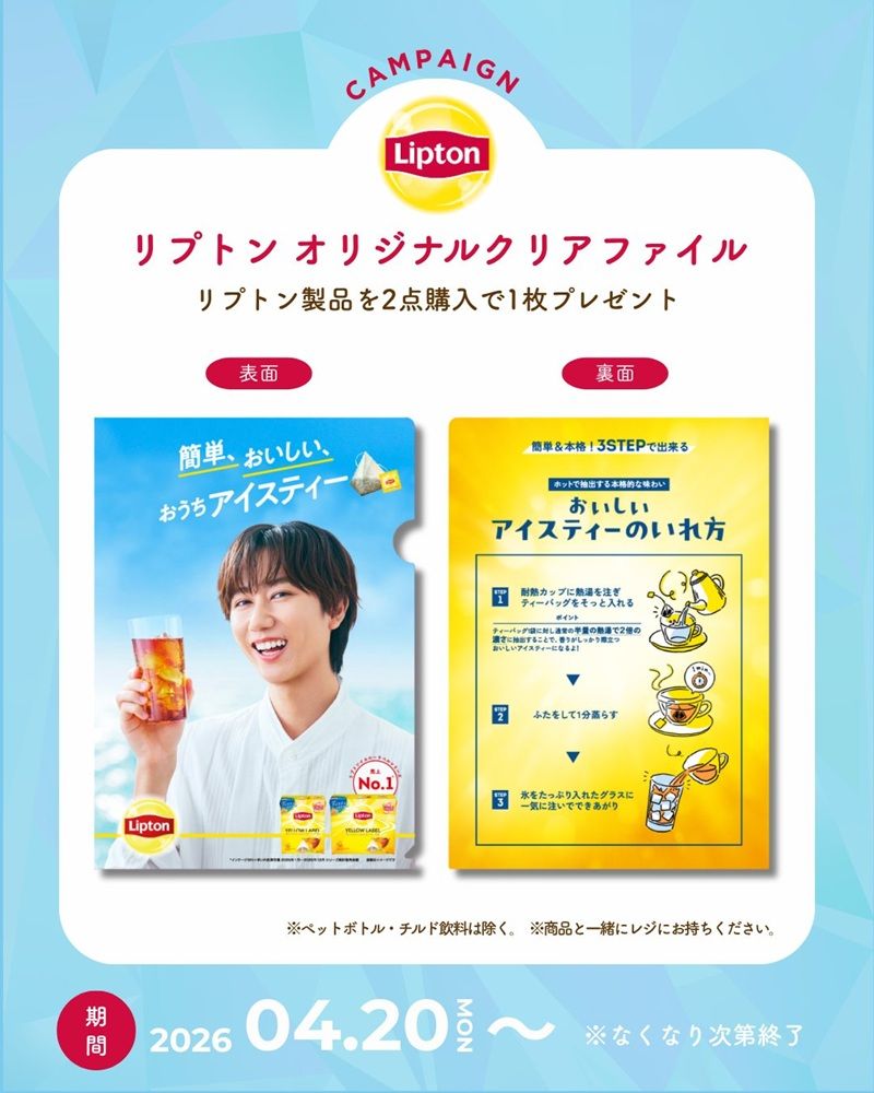 リプトンでは、『Snow Man阿部亮平』クリアファイルのおまけがもらえるキャンペーンを、2026年4月20日(月)から開催します!