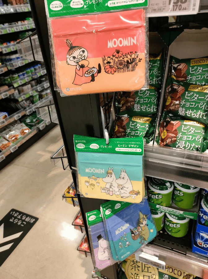 キシリトールガムを2点、または、ボトルガムかパックガムを1点購入すると、ムーミンデザインのジッパーポーチが貰えるキャンペーンを実施していました。