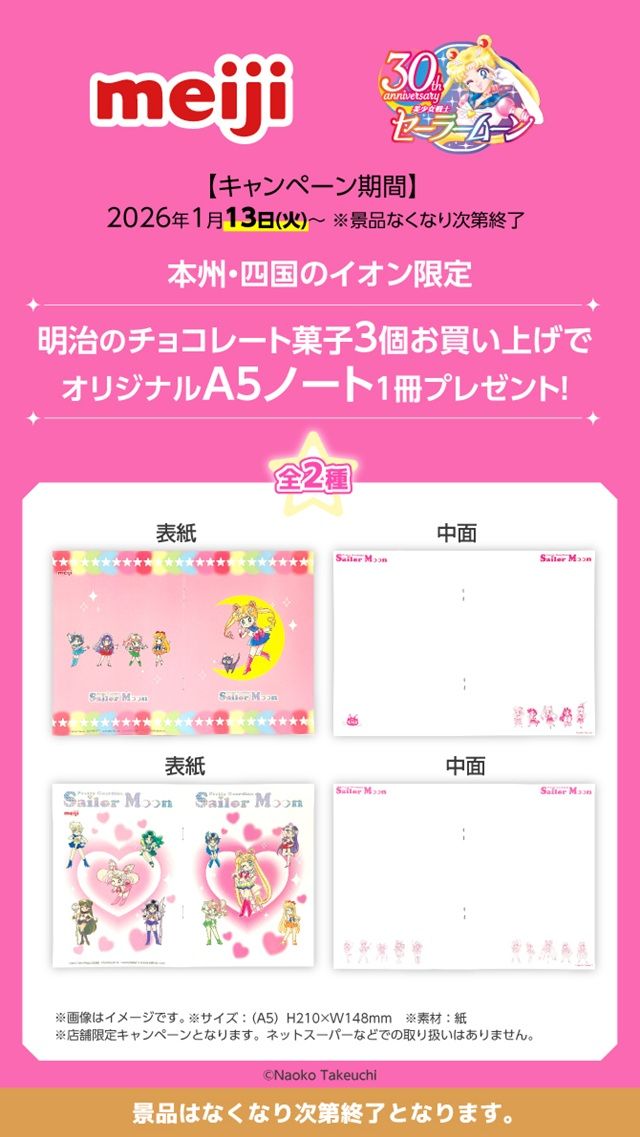 イオン『明治×セーラームーン』コラボ!オリジナルA5ノートのおまけが店頭でもらえるキャンペーンが2026年1月15日(木)より開催!