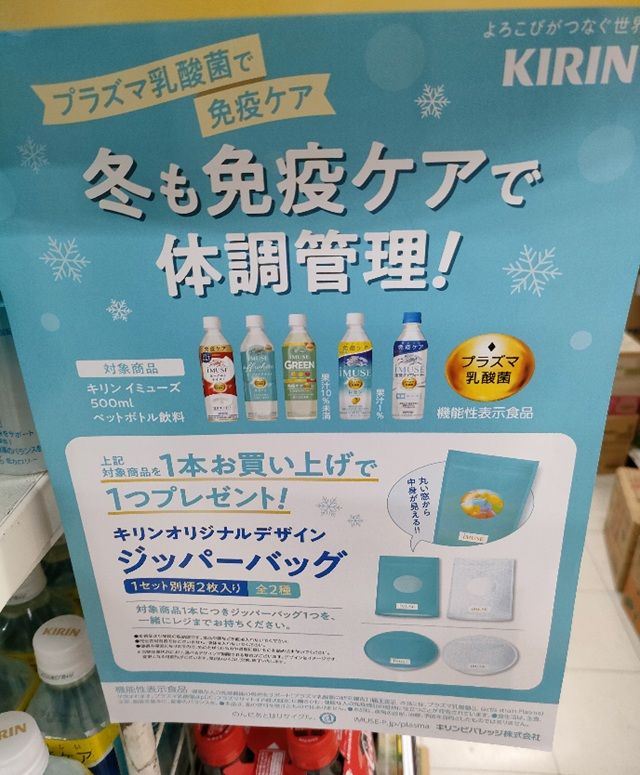 キリン免疫ケア イミューズ『ジッパーバッグ』おまけが店頭でもらえるキャンペーンの開催店はどこ?全2種類!