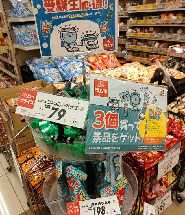 ブドウ糖代表お菓子のラムネ!店舗のラムネコーナーにある対象商品を2個買うと、ラムネの風船かテスト勉強に使える暗記セットが貰えます✨(ラムネの自販機もあります🫣)