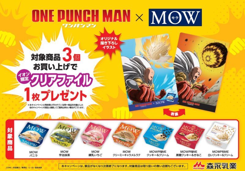 森永乳業MOW『ワンパンマン』コラボ!クリアファイルのおまけがもらえるキャンペーンがイオン限定で開催!