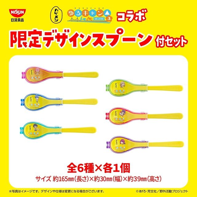 日清食品グループ オンラインストア、Amazon、ヨドバシ.com、楽天24で、「日清のカップメシ」シリーズの限定セットをお買い上げいただいた方に、持ち運びに便利なハーフケース付きの「カレーメシ×ゆるキャン△ 限定デザインスプーン」全6種のコンプリートセットをプレゼント