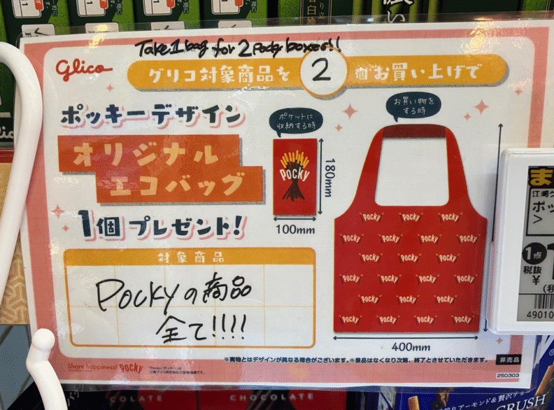 ポッキーを2点購入すると、ポッキーデザインのエコバッグが貰えるキャンペーンを実施していました。#グリコ #ポッキー #エコバッグ #おまけ pic.twitter.com/rWvJFlLrbN