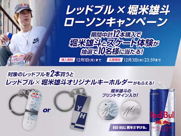 全国のローソン店舗でレッドブル・エナジードリンク(全商品対象)を購入すると、その場で“レッドブル×堀米雄斗 オリジナルキーホルダー”がもらえるキャンペーンが開催!