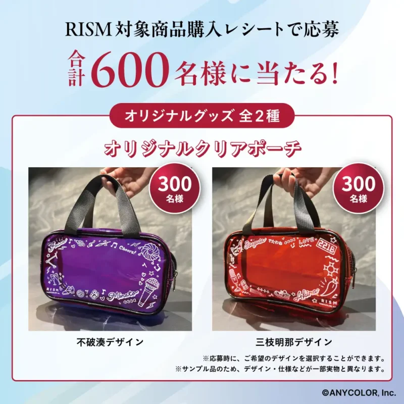RISM対象商品1点を店頭購入したレシートでご応募いただくと、抽選で合計600名様にオリジナルクリアポーチが当たります。こちらも不破湊デザイン(300名様当選)、三枝明那デザイン(300名様当選)をご用意。おふたりのイメージカラーとモチーフがあしらわれたオリジナルデザインです。