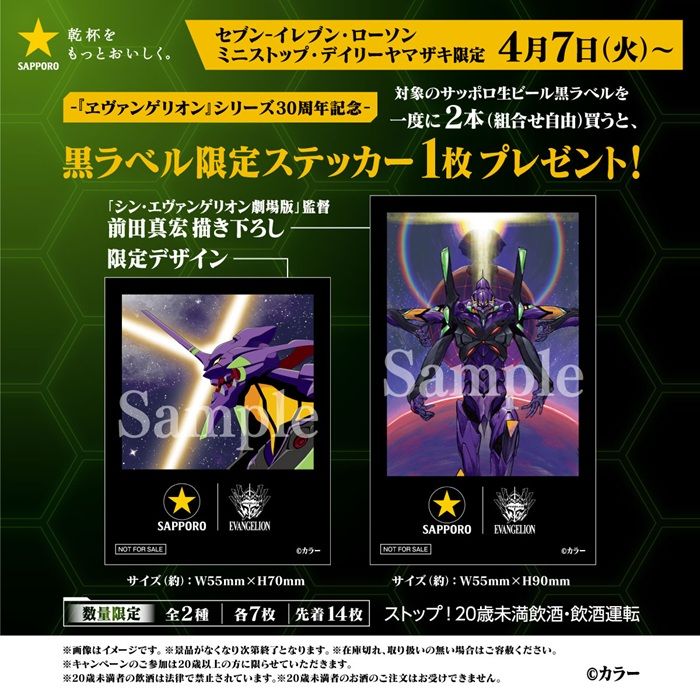 サッポロ生ビール黒ラベルでは、2026年4月から『エヴァンゲリオン』コラボのキャンペーンを開催します!セブンイレブン、ローソン、ミニストップ、デイリーヤマザキのコンビニ限定で、対象商品を購入するとステッカーのおまけがもらえるキャンペーンが開催します!