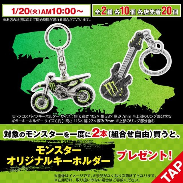 セブンイレブン限定『モンスター オリジナルキーホルダー』おまけが店頭でもらえるキャンペーンが2026年1月20日(火)より開催!モトクロスバイクとギターの2種類!