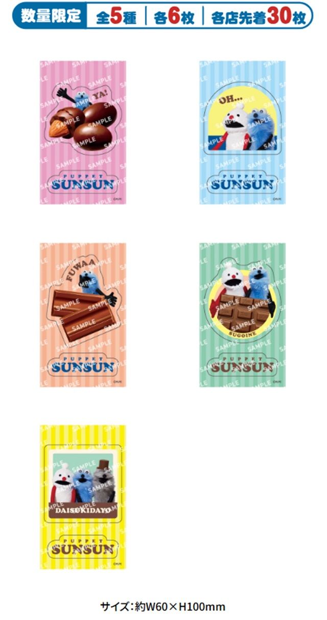 対象のチョコレートを一度に2個(組合せ自由)買うと、パペットスンスン オリジナルステッカーを1枚プレゼント!