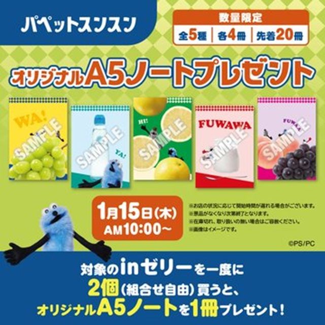 対象のinゼリーを一度に2個(組合せ自由)買うと、パペットスンスン オリジナルA5ノートを1冊プレゼント!