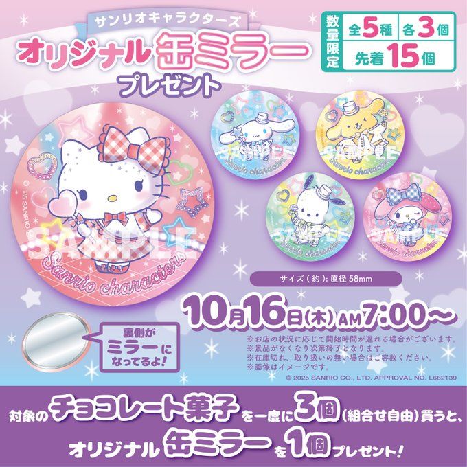セブンイレブンでは、2025年10月16日(木)から『サンリオキャラクターズ』コラボのキャンペーン第3弾を開催します!対象商品の明治のお菓子を購入すると『オリジナル缶ミラー』のおまけがもらえます。