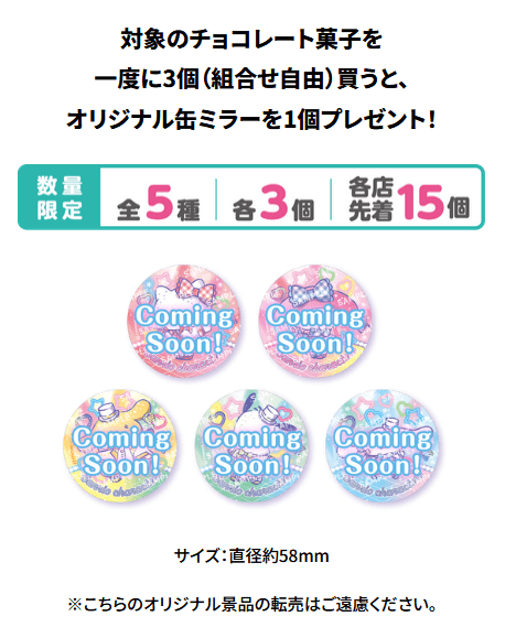 対象のチョコレート菓子を一度に3個(組合せ自由)買うと、オリジナル缶ミラーを1個プレゼント!