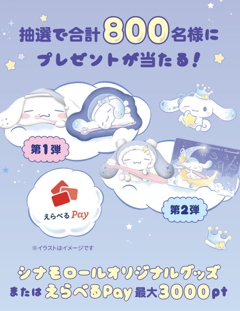 - 期間中に対象のオーラルケア製品をご購入いただくと、株式会社サンリオの人気キャラクター「シナモロール」とコラボレーションしたオリジナルグッズや、「えらべるPay®」が抽選で当たります。