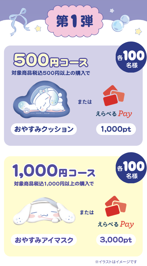 賞品 : 第1弾 おやすみクッション または 「えらべるPay®︎」1,000ポイント (抽選で各100名様)