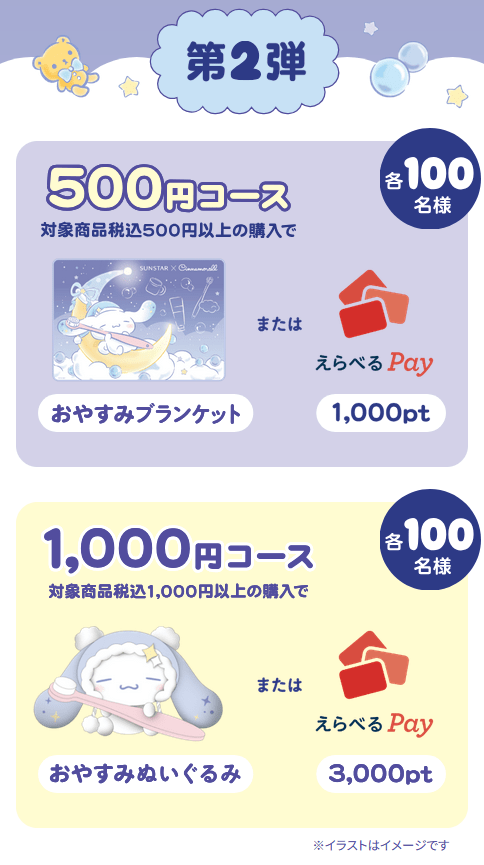 賞品 : 第1弾 おやすみぬいぐるみ または 「えらべるPay®︎」3,000ポイント (抽選で各100名様)