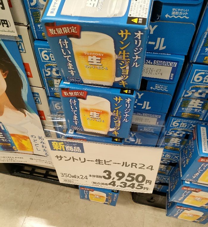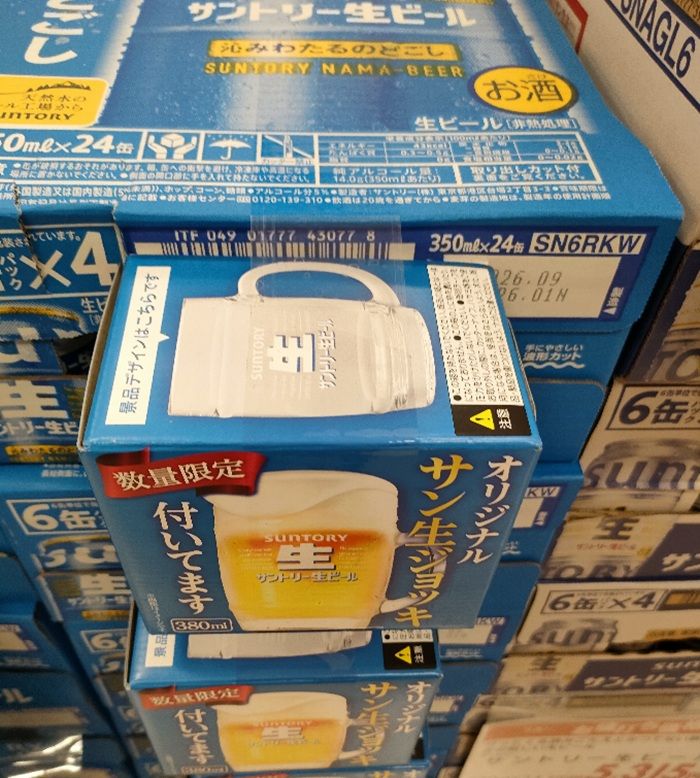 2026年2月中旬から販売促進のキャンペーンを開催しています!サントリー生ビール の『缶型エコバッグ』『サン生ジョッキ』グッズ付きのセットが販売しています。