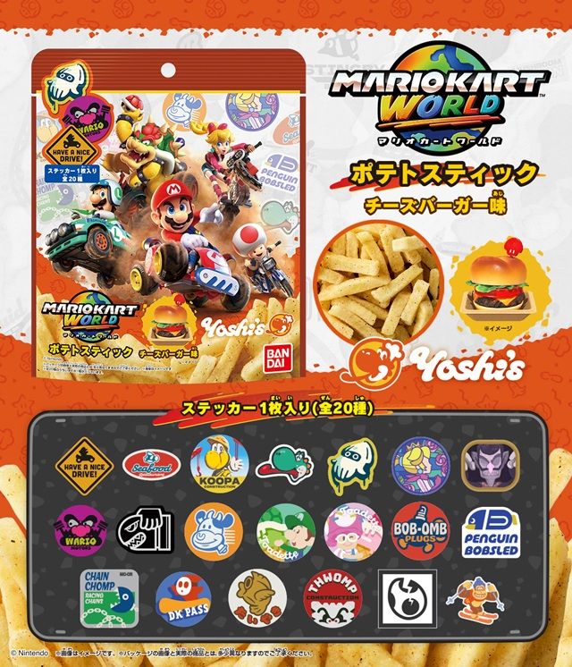『ヨッシーズのダッシュフード』をイメージしたチーズバーガー味ポテトスティックに、ゲーム内に登場するデザインの”ステッカー”がついています。