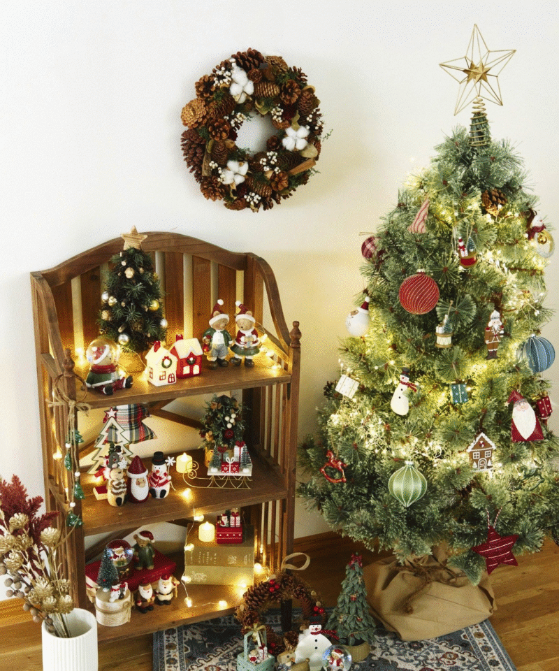 ●枝葉の間に散りばめられた松ぼっくりが、素朴であたたかみのある雰囲気を演出します。