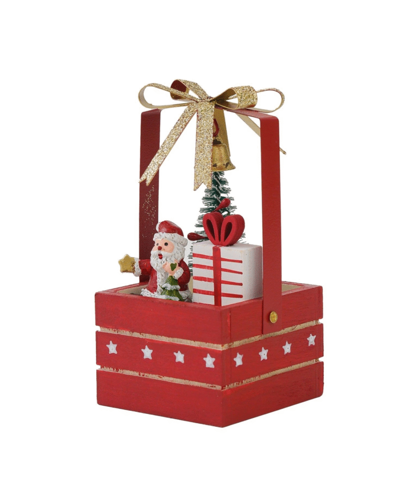 ●赤いプレゼントボックスに、サンタクロースが小さなツリーやギフトボックスと共に配置され、金色のリボンとベルが華やかさを加えます。