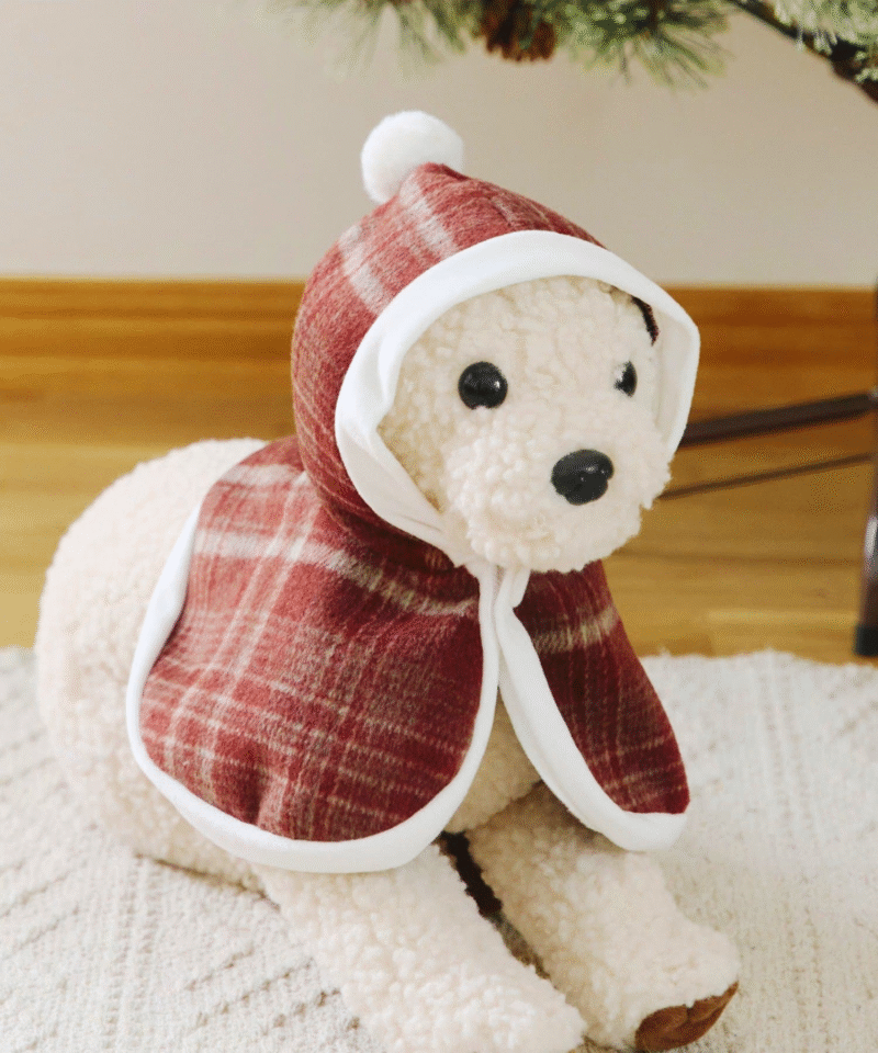 ●サンタ帽風のフードがついた、小型犬用サンタポンチョ。