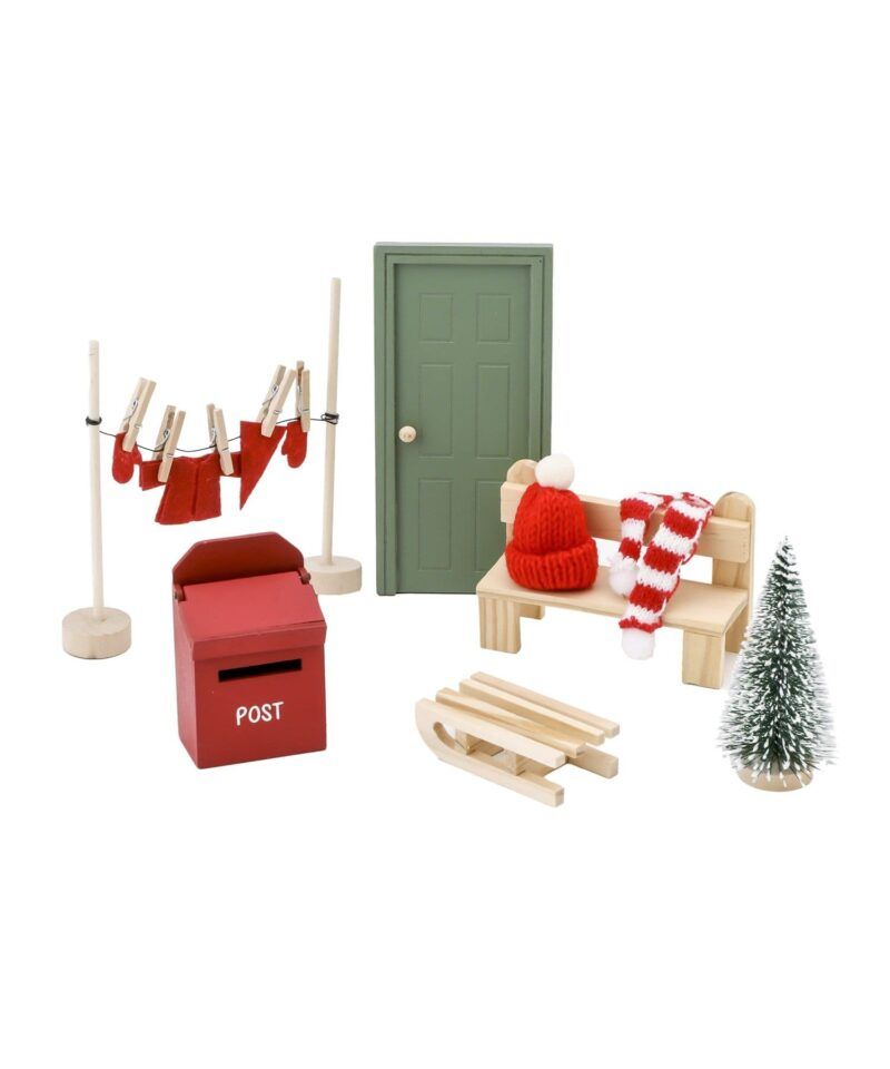 セット内容:箱、ドア、ポスト、ベンチ、物干し竿、ミニツリー、ソリ、ニット帽、マフラー