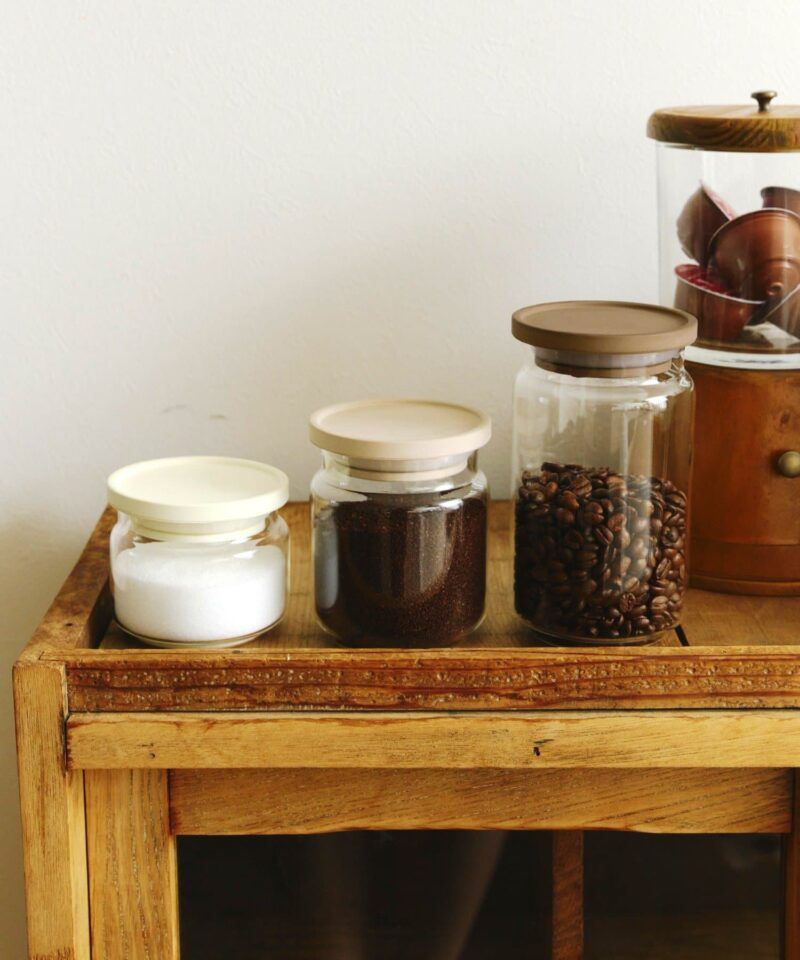 ●湿気を防いで中身をしっかり守る、珪藻土蓋付きのガラスキャニスター。
